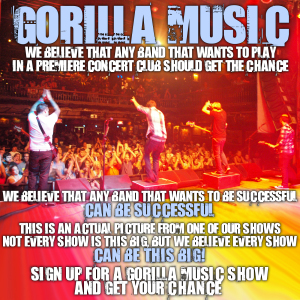 The Battle of the Bands has become more popular than ever. It is attracting huge crowds and a mammoth amount of interest in local music scenes across the country. Our Battle of the Bands Concert Series is world famous! Gorilla Music works with prestigious concert clubs in over 65 cities nationwide. Gorilla Music helps to opens doors for local bands hoping to make an impact within their music scene. Through a battle of the bands, groups are able to gain experience, play in great venues for great crowds, and learn more about the music business itself. Groups recognize that a battle of the bands can help them build a fan base, improve their bio, and gain the respect of their fans, other bands, promoters, and club owners. Winning a battle of the bands is the fastest way to take your group to the next level. Seeing that crowd and hearing hundreds of people screaming your group’s name will make an incredible impact on everyone there the night of your performance. Gorilla Music events are some of the biggest local shows in the country and probably the world. After a battle of the bands, groups are cherry-picked for other gigs, concerts and other opportunities. Our regional and national music fests attract thousands of people including fans, record label reps, and talent scouts. Our weekend showcases help groups define their status in their market place and actually increase their value to clubs and fans alike. We work with some of the greatest venues across the United States, such as The Knitting Factory in Boise, World Cafe Live in Philadelphia, The Masquerade in Atlanta, The World Famous Agora in Cleveland, DNA Lounge in San Francisco, and The Curtain Club in Dallas, just to name a few. In addition to all our great shows and gigs we have an amazing Band Management Program and learning center, with literature and educational videos available online.